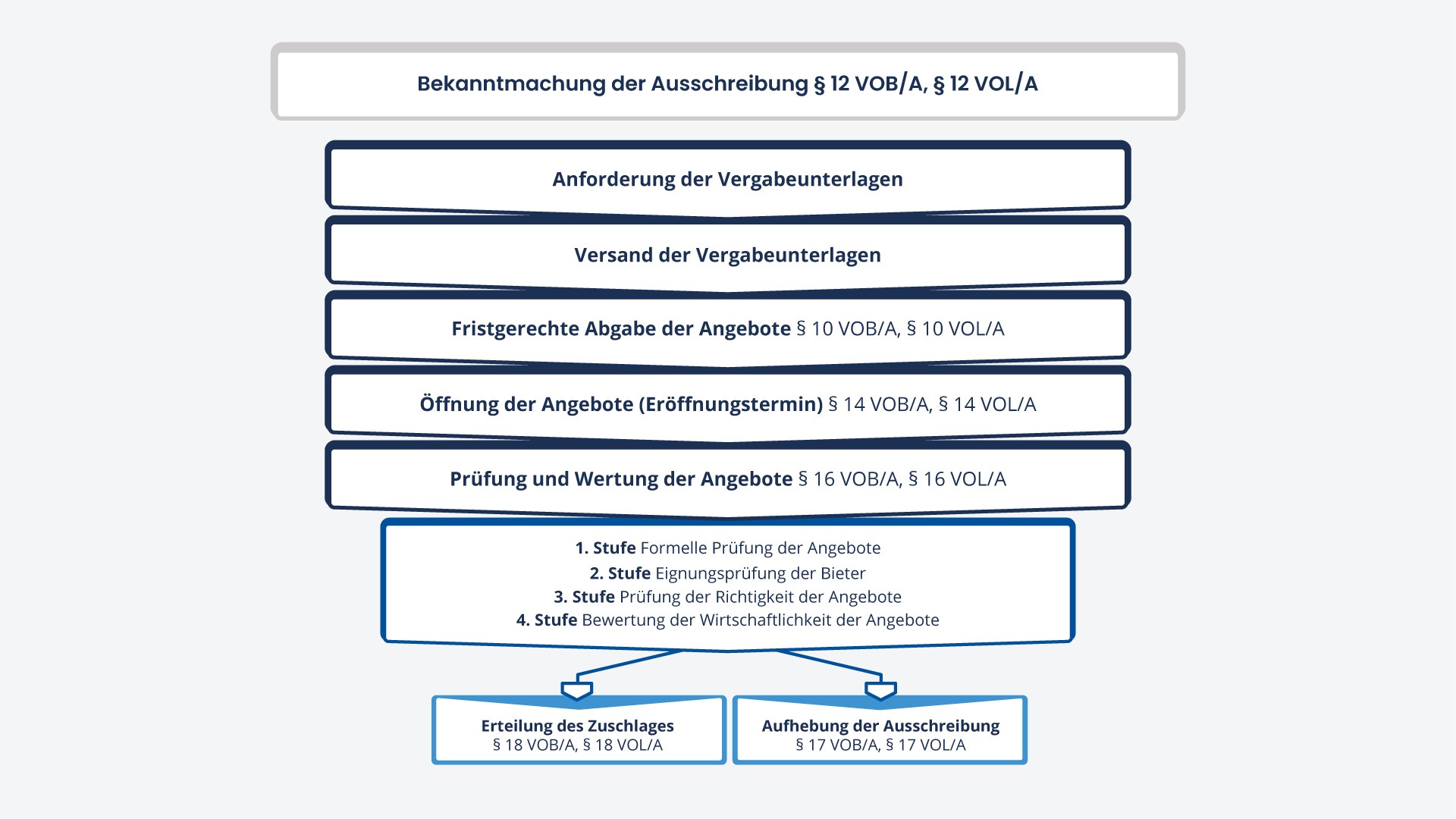 Das Verfahren ist formal strukturiert und verfolgt den Zweck, die gewünschten Leistungen und Lieferungen von den Unternehmen zu beziehen, der das aus wirtschaftlicher Sicht günstigste Angebot eingereicht hat. Die Ziele dahinter lauten: