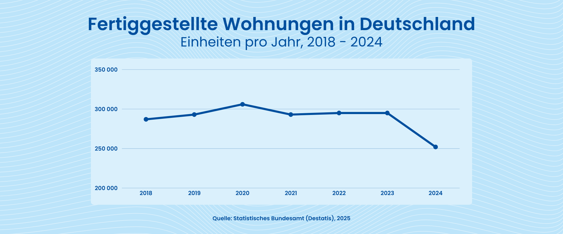 2024 erreichte die Zahl an fertiggestellten Wohnungen ein seit 2015 erstmaliges Tief von nur 252.000 Wohnungen – ein Rückgang von 14,4 Prozent im Vergleich zum Vorjahr. Besonders starke Rückgänge erlebten Ein- und Zweifamilienhäuser: Jeweils um 22,1 Prozent und um 26,2 Prozent wurde hier weniger gebaut. Durch Lieferengpässe und Fachkraftmangel hat sich der Bauprozess bereits auf 26 Monate statt 20 Monate wie im Jahr 2020 verlängert. Nicht nur die fertiggestellten Wohneinheiten gehen zurück. Auch das Bauvolumen von Nichtwohngebäuden, wie Lagerhallen, Büro- und Verwaltungsgebäuden, hat sich um 7,3 Prozent reduziert.
