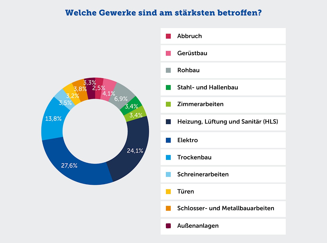 Es verwundert jedoch, dass dieser relativ hohe Anteil von Gewerkeausfällen die termingerechte Projektfertigstellung nicht maßgeblich beeinflusst. So bleibt es trotz deutlicher Gewerkeausfälle bei einer verhältnismäßig termingetreuen Projektumsetzung. Auch hier zeigt sich, dass die Branche flexibel und kreativ Probleme löst.