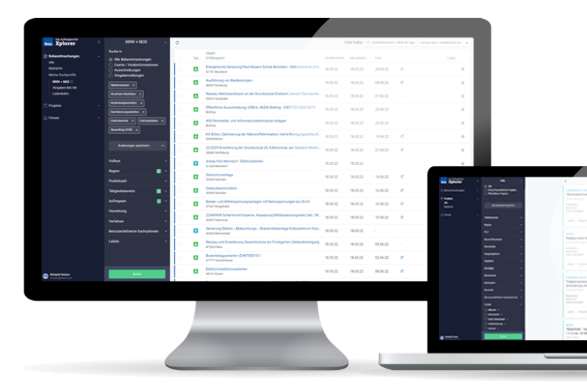 Sparen Sie sich die aufwändige Suche nach neuen Vergabebekanntmachungen aus dem Trockenbau auf zahlreichen Vergabeportalen und Vergabemarktplätzen. Im ibau Xplorer erhalten Sie nahezu jede Auftragschance aus ganz Deutschland - egal, ob Sie in Kassel, Bocholt oder Coesfeld agieren! Geben Sie einfach den Ausführungsort, den CPV-Code oder die Auftragsart in die Suche ein, schon erhalten Sie relevante Vergabebekanntmachungen für Trockenbauten. Filtern Sie anschließend nach Angebotsfrist, Entfernung oder Auftraggeber und entdecken Sie so das passende Projekt für Ihr Unternehmen. Noch leichter geht die Suche mit den individuellen Suchfiltern von der Hand, diese werden passgenau auf Ihre Bedürfnisse zugeschnitten. So klappt die Suche nach Vergabeverfahren ganz leicht.